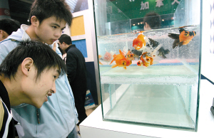 昨日,南坪,“建科展”上市民正望著魚缸中透氣不透水的“墻壁” 記者 張路橋 攝