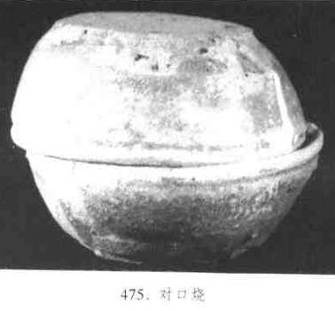 瓷器坯體或碗形匣缽一仰一覆口緣相對扣合在窯爐中焙燒的方式。對口燒的器物口沿都無釉,有的口沿留有粘痕。有的對口燒大器內(nèi)可套燒小件器物,以充分利用窯內(nèi)空間。南朝洪州窯對口燒平底缽,是現(xiàn)今考古發(fā)現(xiàn)最早的覆燒實(shí)例。唐代山西渾源窯,四川宋代瓷窯、遼代瓷窯、杭州烏龜山南宋官窯,金、元磁州窯、清德化窯都曾用過對口燒。(見圖475)