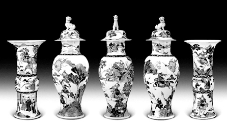 五件一套的大型組合陳設(shè)花瓶是專門為歐洲的宮廷豪宅設(shè)計(jì)的,從18世紀(jì)初起,就成為最時髦的西洋客廳擺設(shè),深受王公貴族的喜愛。此套組合陳設(shè)花瓶有史可考的前主人是美國羅得島上的名門凡阿倫家族,祖上曾當(dāng)過南北戰(zhàn)爭時的將軍。19世紀(jì)中葉以后,凡阿倫家族在羅得島上的新港造了一幢英式豪宅,又從歐洲古堡里搬來大量古董,此套花瓶估計(jì)就是那時搬來的。