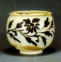 在磁州境內(nèi)(今磁縣觀臺鎮(zhèn)、彭城鎮(zhèn)一帶),故名。建于宋代,所燒器物純供民間使用,品種繁多,如瓶、罐、盆、碗、缸、甕等,以白地黑花(屬釉下彩裝飾)為主要特征。白地黑花保留了不少民間喜聞樂見的紋飾,如馬戲、孩童釣魚、池塘趕鴨、蹴球等,題材豐富而清新,紋飾線條流暢豪放,黑白色彩對比強(qiáng)烈,發(fā)展了陶瓷的裝飾藝術(shù),當(dāng)時深受北方地區(qū)人們喜愛,曾對南北方不少瓷窯產(chǎn)生很大影響。