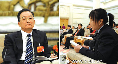 來自廣東佛山的農(nóng)民工代表胡小燕發(fā)言(右圖)時說:“農(nóng)民工最關(guān)心的事情就是擔(dān)心留在家鄉(xiāng)的孩子每天是不是吃飽了飯,穿暖了衣,上學(xué)的路上是不是安全……”,溫家寶總理聽胡小燕發(fā)言時表情凝重(左圖)。聽完胡小燕的發(fā)言,溫家寶總理說:“你關(guān)心的問題,也是我關(guān)心的問題。”