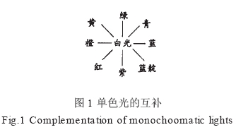 可見光的波長(zhǎng)范圍為760~400nm,色譜按紅、橙、黃、綠、青、藍(lán)、藍(lán)靛、紫等順序分布。白光是復(fù)色光,波長(zhǎng)可以是連續(xù)的也可以是不連續(xù)的,由兩種或多種單色光按一定的比例混合組成白光,組成白光的兩種單色光稱為互補(bǔ)光(見圖1)。例如,KMnO4溶液對(duì)可見光中波長(zhǎng)λ=525nm 的綠光有很強(qiáng)的吸收,對(duì)波長(zhǎng)大于或小于525nm 的光波吸收逐漸減弱,直至不吸收,所以我們看見KMnO4 溶液的顏色為紫色,而紫色是綠色的互補(bǔ)色。
