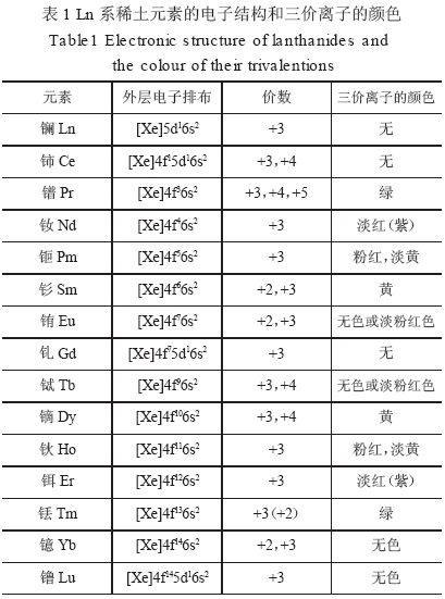稀土氧化物有多種,如LnO,Ln2O3 和LnO2,其中Ln2O3較常見。隨著原子序數(shù)的遞增,電子被填充在4f 軌道上,其電子結(jié)構(gòu)、離子的價(jià)態(tài)及三價(jià)離子的顏色詳見附表1。