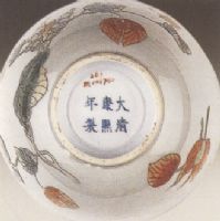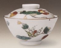 說 明: 此器蓋口小于碗口,是康熙時期的創(chuàng)新器型,以后各朝均有燒制.此外,于豆青釉上描繪五彩紋飾,亦屬創(chuàng)新之舉.