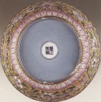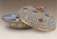說 明: 此盒鏤雕技法精巧細(xì)膩,雖裝飾繁密,但層次分明,繁而不亂.此種將粉彩與鏤空相結(jié)合的技法,至乾隆時曾被大量使用.
