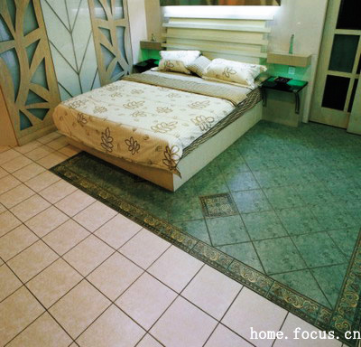主臥室 主臥室地面以暖白色仿古磚為主調(diào),床前草綠色的仿古磚砌出一片“綠洲”,讓臥室的主人隨時嗅到大自然的氣息。自然、清新靈性空間。