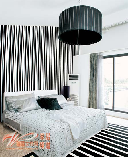 用黑白條紋布置臥室,運(yùn)用在墻面、地毯、吊燈上,強(qiáng)烈的成熟、穩(wěn)重風(fēng)格就打造而成了。在這樣的臥室中營造優(yōu)雅感,要依靠帶有鏤空花朵圖案的白色針織繡品。將其大面積地鋪陳在黑白條紋中,醒目而效果卓越,可以營造充滿優(yōu)雅氣質(zhì)的臥室。