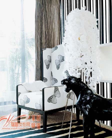 白色的蝴蝶圖案單人坐椅為臥室里的休閑空間帶來了纖柔的優(yōu)雅感,再配以夢幻感的發(fā)絲造型燈和充滿野性的仿真雕塑,臥室的休閑區(qū)便具有了貴族的氣質(zhì)。