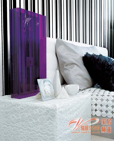 雅致的紫色運(yùn)用在黑白條紋的空間當(dāng)中,讓紫色的高貴和漂亮更加彰顯出來,也讓臥室充滿了流行和時(shí)尚的味道。搭配床品的優(yōu)雅感,床頭柜上也要罩上一塊能表現(xiàn)精致和優(yōu)雅的白色布藝,配上紫色臺(tái)燈,讓床頭的意境變得成熟而完美。