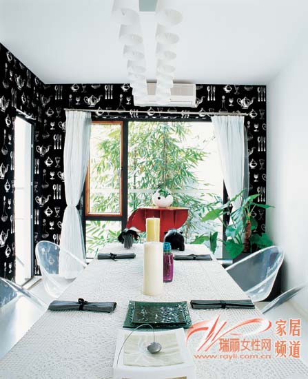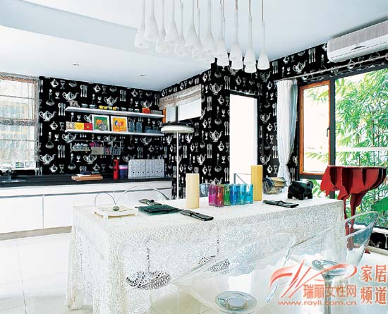 在布置豐滿的餐廳中,為餐桌選擇一塊維多利亞披肩般的美麗桌布,讓餐桌展現(xiàn)不可多得的可愛和輕柔格調(diào),這樣的餐桌營造出的是安靜、溫馨的就餐氛圍,更可以為平凡的餐廳帶來高尚生活品質(zhì),恰到好處地表現(xiàn)出硬朗的黑白色調(diào)與輕柔材質(zhì)的結(jié)合。