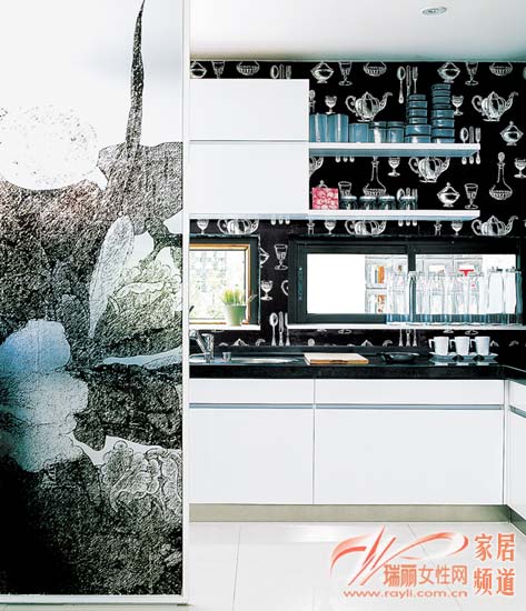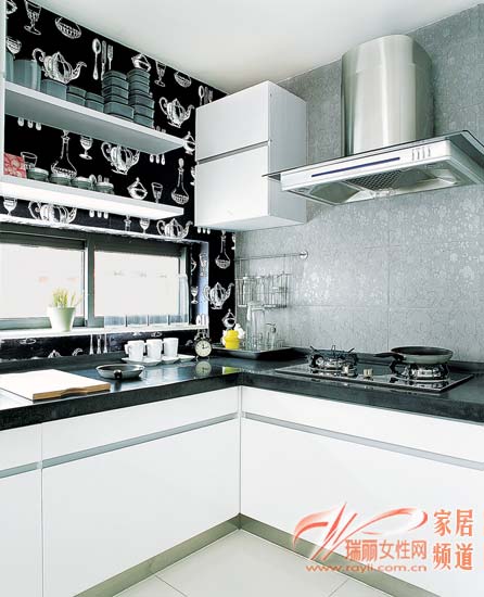 在黑與白的空間中,工業(yè)設(shè)計(jì)的廚具和灶具,表現(xiàn)出現(xiàn)代家庭的極簡生活理念。同時(shí),在櫥柜上擺放一些可愛的調(diào)料瓶、餐具,可愛感也可以非常突出地表現(xiàn)出來。在操作臺(tái)的黑白色調(diào)對(duì)比之下,銀灰色古典主義的墻紙為廚房增添了一種不凡的超脫,成為精致生活的絕佳代表。