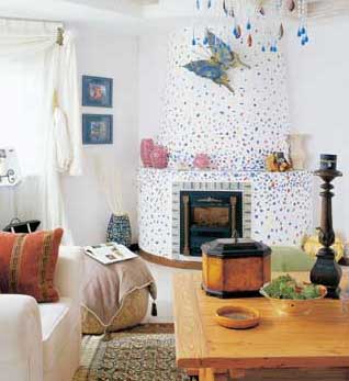 簡潔流暢的壁爐設計是典型的愛琴海風格,手工涂抹的壁爐結構是用白水泥做底,將彩色瓷碗敲破后,一塊塊粘貼上去的。而那看似隨意垂掛、實為用心設計的窗幔又為這一閑適情調(diào)的客廳增添了一抹慵懶。