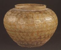 說 明: 東漢.胎質(zhì)灰黑,外施黑褐色釉,不及底.裝飾手法與印紋陶無異.此種黑釉器在當時常與青釉器同窯燒造.