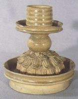 說 明: 南朝.胎灰白,施青釉開片.造型別致新穎,是古代青瓷燭臺中少見的精品.
