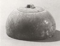說 明: 南朝.胎質灰白,施青綠色釉,開冰裂細片紋,底露素胎.為古代衡器.