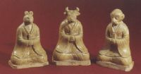 說 明: 三俑著衣,持笏,盤坐,形象逼真,釉色青黃.十二相屬之說始于東漢,而十二生肖俑則創(chuàng)于隋,并常用以記時(shí).