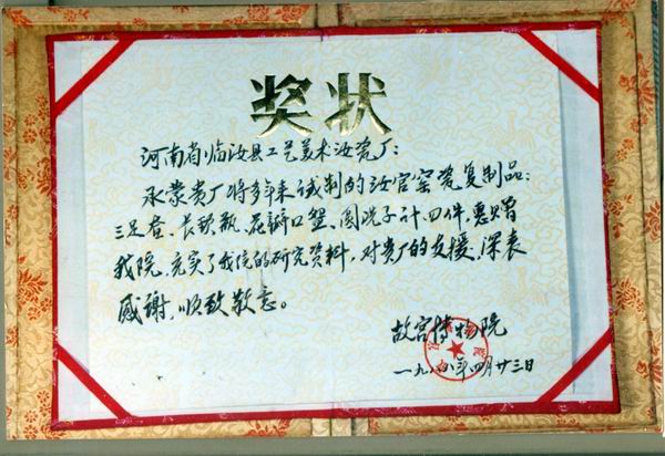 1983年她和郭遂師傅一起研究恢復(fù)成功了汝窯天蘭釉,獲河南省科技成果獎(jiǎng)。