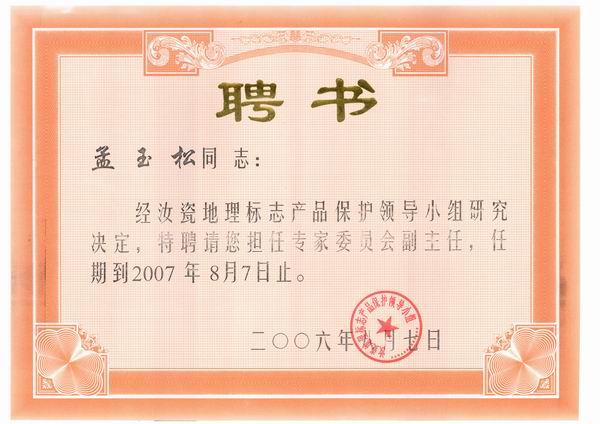 孟玉松同志一貫熱愛(ài)黨、熱愛(ài)祖國(guó),在自己的工作崗位上兢兢業(yè)業(yè)、刻苦專業(yè)業(yè)務(wù)技術(shù),為汝瓷的恢復(fù)和發(fā)展做出重大貢獻(xiàn)。