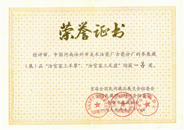 1999年她制作的汝瓷三羊尊和三足盤獲全國(guó)首屆民間藏品展交會(huì)一等獎(jiǎng)。