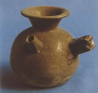 說(shuō) 明: 胎質(zhì)灰白,質(zhì)地堅(jiān)密.通體施青黃釉.此壺器型很小,與藥碾等伴出,是一種溫藥用具.