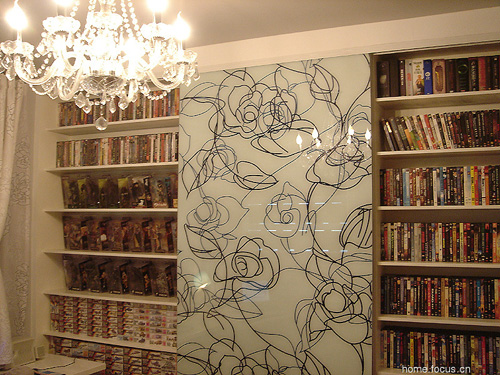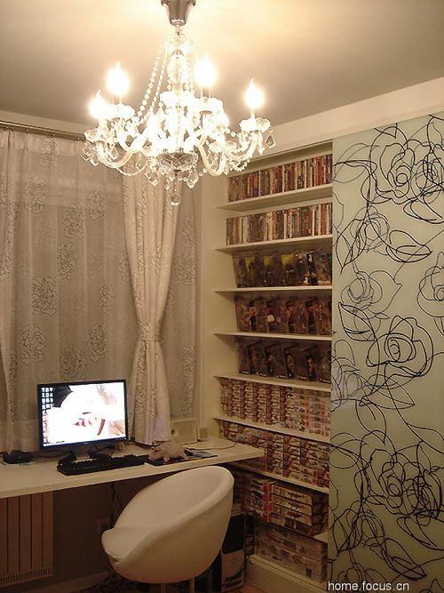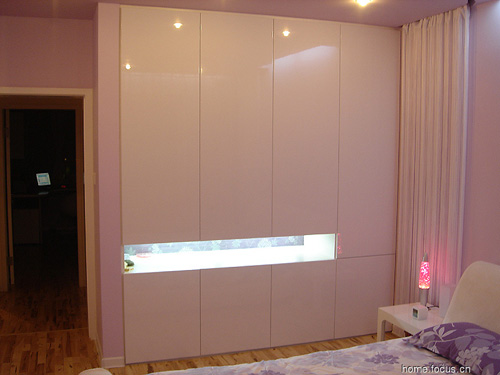 自己設(shè)計的衣柜,中間的鏤空處貼的紋樣壁紙和電視墻呼應(yīng) 換個角度