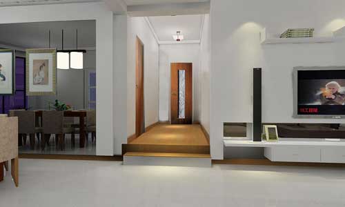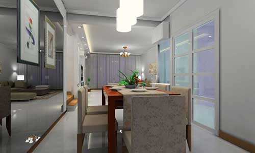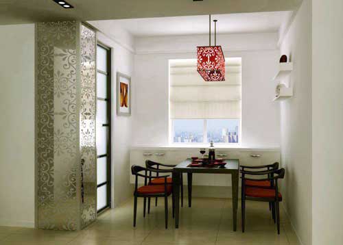 方案將原本正對著入戶門的廚房門洞改到了廚房與餐廳相鄰的位置,作推拉門,在空間上縮短了由廚房到餐廳的距離。在原有的廚房門洞的位置作鞋柜,節(jié)省了空間并使空間更加合理,緊湊。衛(wèi)生間的門使用了透光材料,充分利用自然光,增強了過道的光線。餐廳靠窗戶位置,作了一個通長的與窗臺一般高、底部懸空的餐柜,增強了空間的儲藏收納功能。如果我們再在餐柜上擺放幾盆自己鐘愛的花卉,這樣,隨時可讓家人和朋友聞到家的溫馨和清香。