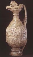 說 明: 胎色灰白,釉色淡青略泛淺黃,釉厚處呈玻璃狀.此壺造型優(yōu)美,裝飾富麗,是唐代北方青瓷器的代表作品.