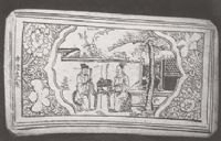 說 明: 黃白胎,表施化妝土,釉面呈乳白色,底無釉.畫面主題突出,安排得體,人物生動.底印"王氏壽明"鐘形戳,并有墨書"許"字.枕面邊框線間有"漳濱逸人制"五字.此枕當(dāng)是觀臺窯產(chǎn)品.