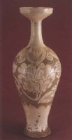 說 明: 灰白胎.粉衣上掛透明釉不到底,隱現(xiàn)褐色小斑點(diǎn),有細(xì)開片紋.構(gòu)圖雅潔,為遼墓出土的早期剔粉作品.