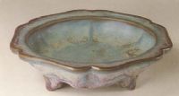 說 明: 胎色灰褐,造型敦厚.內(nèi)壁蔚藍(lán)色釉內(nèi)含"蚯蚓走泥紋",外腹壁玫瑰紫色的乳濁釉,色彩絢麗,器底芝麻醬色,刻有"六"字銘記.此洗是北宋官窯產(chǎn)品,為宮廷使用.