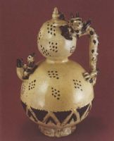 說 明: 淡黃色胎.掛牙白釉,釉層較厚,足根露胎.此注壺頂無口,而在圈足內(nèi)挖一圓注水孔,與通入壺內(nèi)的注水管相連,裝水時將壺倒置.可謂構(gòu)思奇特,獨具匠心.