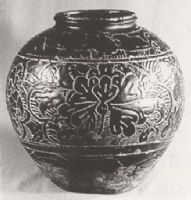 說 明: 通體施黑釉,釉質(zhì)光亮,近底露橙黃粗胎.紋飾豪放,線條簡(jiǎn)練.