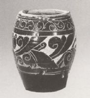 說 明: 橙黃色粗胎,內(nèi)壁施黑釉,外壁施醬釉,剔花圖案.可能為釀造器皿.