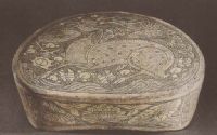 說 明: 畫面之外的空白處用鐵工具印戳珍珠地.紋樣生動細膩,構(gòu)圖清新活潑,具有強烈的民間生活氣息.