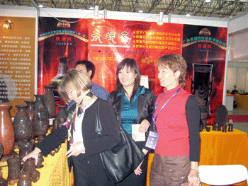 4月10日,聯(lián)合國教科文組織官員在南昌舉行的第43屆“全國工藝品、旅游紀念品暨家居用品交易會”欽州展廳參觀欽州坭興陶工藝品。欽州市有13件坭興精品參評此屆交易會,同時該市還有100多件作品參展。