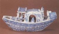 說 明: 青花顏色凝重鮮艷,有赭色斑.白釉瑩潤,白中閃青.陶瓷模型船較為罕見.
