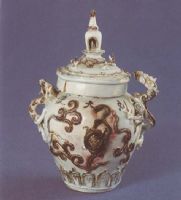 說 明: 胎質(zhì)細(xì)膩,青白釉.堆塑飾以釉里紅點(diǎn)綴,造型生動(dòng),形象逼真.全器造型奇特,工藝精巧.