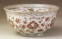 說 明: 胎質(zhì)精細(xì),色潔白.釉色白中閃青,施釉較厚.紋飾線條流暢,圖案清晰,呈色艷麗.燒制釉里紅器火候不易控制,呈色多不穩(wěn)定,而此碗為釉里紅器中成功之作.