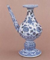 說 明: 用蘇麻離青料繪纏枝蓮紋,紋飾纖細(xì)有力,色彩艷麗,此器受西亞文化影響,造型雅靜.梵語(yǔ)謂之"凈瓶"、“軍持”.原為宮廷舊藏.
