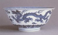 說 明: 胎薄體輕,釉面瑩潤,以蘇麻離青料繪云龍紋,龍體渾圓,雄健有力.無款識.