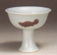 說 明: 通體白釉,釉色滋潤,釉面隱現(xiàn)橘皮紋.魚紋形體豐肥,微凸起,紅白相映,生趣盎然.杯心內(nèi)有青花雙圈"大明宣德年制"楷書款.宣德釉里紅瓷器較少.