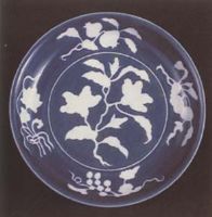 說 明: 胎潔白,圖案的選擇組合寓意吉祥如意.此盤是在素胎上刻花果圖案,然后施白釉,再以藍釉填括,以達到藍地白花顯著分明的效果.