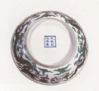 說 明: 此盤外壁釉下用青花勾勒雙龍戲珠紋,并在釉上輪廓線內(nèi)填以綠彩,色調(diào)淡雅清新.是成化彩瓷中難得之品.