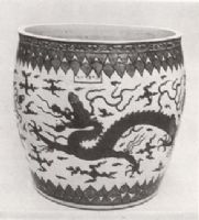 說 明: 造型雄渾,繪圖精美.大型的青花缸,又稱龍缸,在景德鎮(zhèn)專設(shè)有龍缸窯燒造.此缸出土?xí)r內(nèi)貯有油脂,內(nèi)放銅油漂和燈芯,此油缸即所謂的"長明燈".