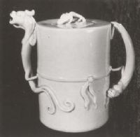 說 明: 通體施象牙白釉,釉汁瑩潤純凈.胎質(zhì)潔白細膩,正中印有方章,字跡不清.此壺造型端莊,構(gòu)思巧妙,制工精細.
