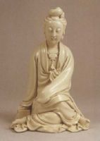 說 明: 通體白胎,牙白釉色,衣紋瀟灑,神態(tài)嫻靜慈祥.據(jù)背部葫蘆形印,為明代瓷塑家何朝宗所作.