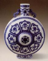 說 明: 瓶因圓腹當(dāng)中凸出一圓月而得名.清雍正早期曾燒制,至乾隆時(shí)重又燒制.此瓶用青花故意點(diǎn)染深淺不同的細(xì)點(diǎn),是仿明宣德青花呈色的效果.
