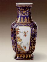 說 明: 此器造型為方形委角,成型工藝復(fù)雜.開光內(nèi)圖案設(shè)色淡雅,與霽藍(lán)描金相互映襯,形成鮮明對(duì)比.
