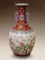 說 明: 腹部主題紋飾是在白釉上繪粉彩花卉樹木圖,刻畫精到,色彩淡雅.此瓶為"慎德堂"款瓷器的代表作品.
