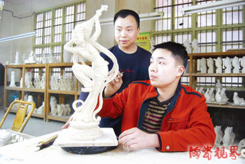 走進(jìn)“飛天藝瓷”,恰巧哥哥鄭雄偉在向幾位遠(yuǎn)道而來(lái)的客戶介紹著作品,“這是結(jié)晶釉,是自然燒成的,也叫窯變釉。”聽(tīng)到作品精細(xì)的制作工藝,幾位客人頻頻點(diǎn)頭,更對(duì)精美的瓷雕贊賞不已。全國(guó)青年星火帶頭人、泉州市第十三屆人大代表、泉州青年創(chuàng)業(yè)精英……1974年出生的鄭雄偉儼然成了德化瓷壇青年一輩的領(lǐng)軍人物:多年來(lái)致力于陶瓷新品種的研發(fā)與創(chuàng)作、品牌培育與推廣及企業(yè)管理和營(yíng)銷,成功配制出高檔陶瓷新品種“凝脂瓷”,開(kāi)發(fā)七大系列一千多種作品。而在許多人的眼里,鄭雄偉更是一位較具經(jīng)濟(jì)頭腦的人,他知道如何將瓷雕與市場(chǎng)相結(jié)合,走出了一條傳統(tǒng)瓷雕市場(chǎng)化的路子!